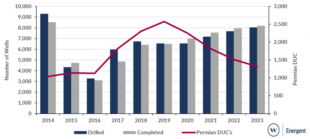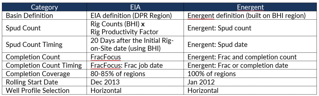 All other clean-up processes ensuring the quality of data are the same for both EIA and Energent. For instance, all permanently abandoned DUC’s and non-oil and gas wells such as disposal or miscellaneous wells are excluded from the calculations.
