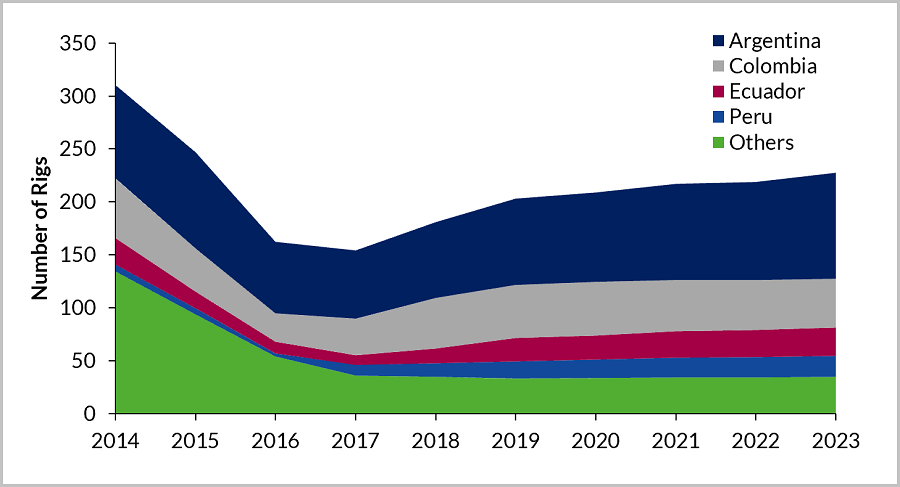 Outside of Argentina, the Llanos and Lower Magdalena Valley basins in Colombia have long been focus areas for E&Ps, providing opportunity for rig contractors including Pioneer Energy Services. Rig demand in the country is also expected to be sustained in the near-term by the development of several small fields, including Castilla, Jacana, and Tigana. Ecuador is expected to see sustained high levels of onshore drilling over the next five years, supported predominantly by the Ishpingo-Tiputini-Tambococha development, with PetroAmazonas having also announced plans to drill an additional 10 wells at the Sacha field, one of the largest producing onshore fields in Ecuador. Key contractors currently present in the country include Chinese NOCs CNPC and Sinopec, Hilong Oil Service & Engineering, Tuscany International Drilling, and Nabors. In Peru, the development of the Situche oil field (GeoPark), as well as activity in blocks 58 (CNPC) is expected to drive an increase in demand for rigs, with PetroTal Corporation also well underway in developing the Bretana oil field in Block 95.