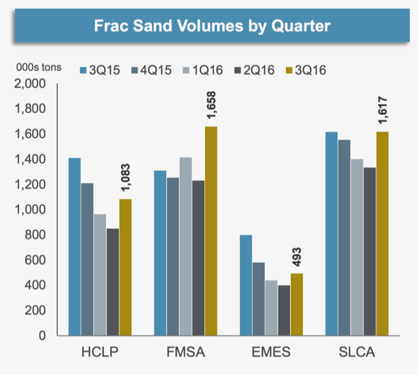 Hi-Crush (NYSE: HCLP) announced the launch of PropStream integrated delivery solutions and investment in PropX to provide last mile logistics. The company’s sand volumes increased by 28% from Q2’16 to Q3’16 compared to FM Santrol who increased volumes by 35% during the same period and that trend is anticipated to continue as the price of oil recovers and operators put frac crews back to work.