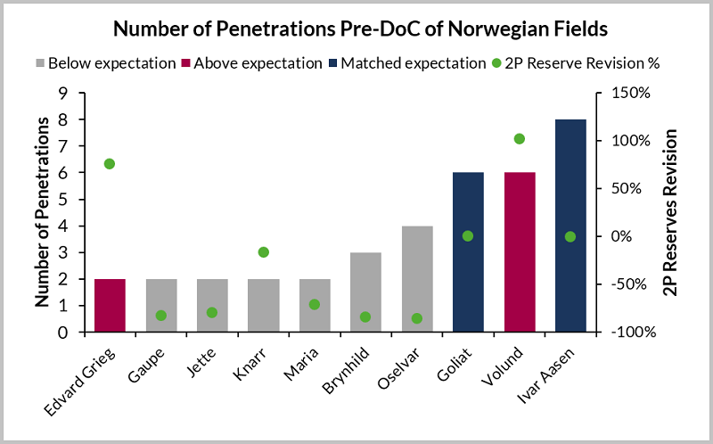 Maria is not the only example of a non-performing field on the NCS with an anomalously low number of penetrations prior to DoC and development concept selection. Figure 2 shows the number of penetrations of reservoirs in the Norwegian Continental Shelf (NCS) for Maria and 9 additional fields starting production since 2009, their performance and 2P reserve revisions as a percentage of sanctioned reserves. The data shows that eight out of the ten fields included in the dataset are non-performing. In addition, the chart shows that Maria and four other fields have all had downward reserves revision of >50%.