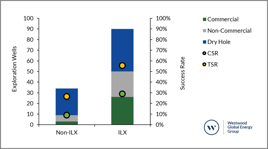 Figure 3: Well results with commercial and technical success rates for North Sea ILX and non-ILX wells, 2015 – 2019.  Source: Westwood analysis