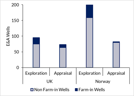 Figure 2: Exploration and appraisal wells drilled in the UK and Norway 2012-2018, split to indicate those that had one or more farm-in partners prior to drilling