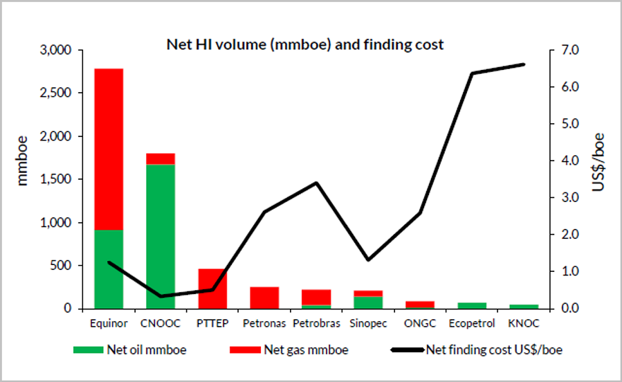 Equinor was by far the most active international NOC explorer, drilling 92 exploration wells in 16 countries outside of Norway with a focus on offshore East Africa, Eastern Canada and in the US GoM. Equinor also discovered the biggest net volume (2.8bnboe), unsurprising given the large number of international wells it has drilled.