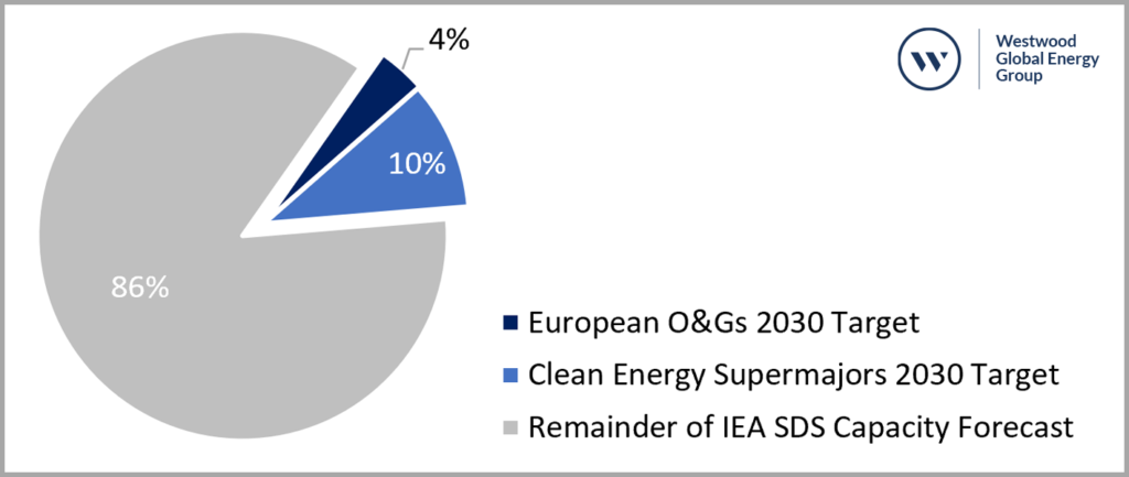 Collectively the six European oil & gas majors have an ambition to grow their renewable capacity to c.189 GW by 2030, compared to c.505 GW by the Clean Energy Supermajors. This amounts to less than (15%) of the target renewable capacity (solar PV and wind) as per the IEA’s Sustainable Development scenario. Whilst the Clean Energy supermajors have a higher target, the growth for oil & gas is higher, at almost 15 the times current capacity, as they start from a lower base.