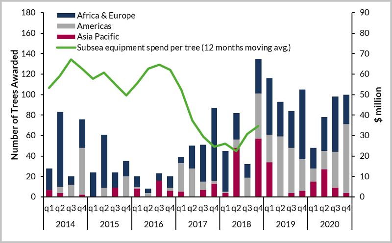 E&P Operators have been keen to lock-in lower industry costs, which is reflected both in the uptick in project sanctioning since 2016 and a notable trend towards pre-FID subsea equipment awards. High profile projects such as Sealion, Golfinho and Liza II have seen Operators agree EPC contracts prior to FID hoping to secure lower pricing for critical subsea infrastructure before a sustained market recovery inflates costs.