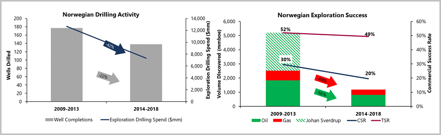 The 2014 – 2018 period saw a significant deterioration of exploration activity levels and performance in Norway compared to the previous five years. Whilst the number of exploration wells completed was down by around a quarter, discovered commercial volumes reduced by more than half, even when volumes from Johan Sverdrup are discounted in order to show the underlying trends. Commercial success rates (CSR) declined from 30% to 20%, but technical success rates (TSR) changed only slightly from 52% to 49%, which appears to reflect a degradation in quality of the pool of prospects being drilled as the proven plays continue to mature.