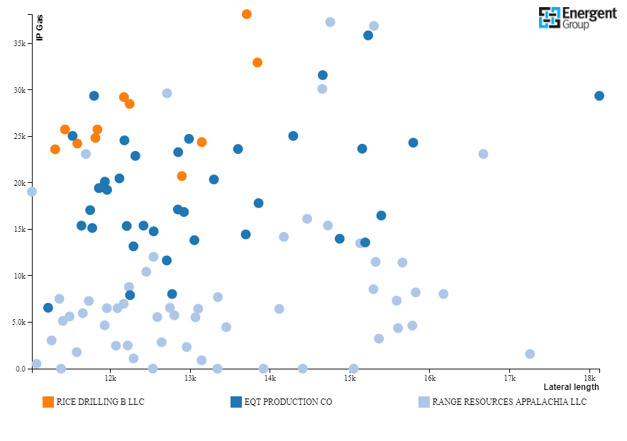 Figure 3. Rice, EQT, and Range Resource IP rates for Longer Laterals Source: Energent Group