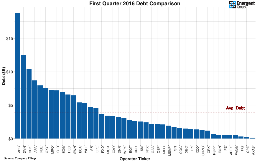 If oil prices hold in the $40 range, expect completion activity to continue to decline with depressed drilling activity. Operator budgets reflect the minimal activity as many would be under large debt loads that require payments. Figure 2 below displays the total debt of selected operators after the first quarter of 2016.