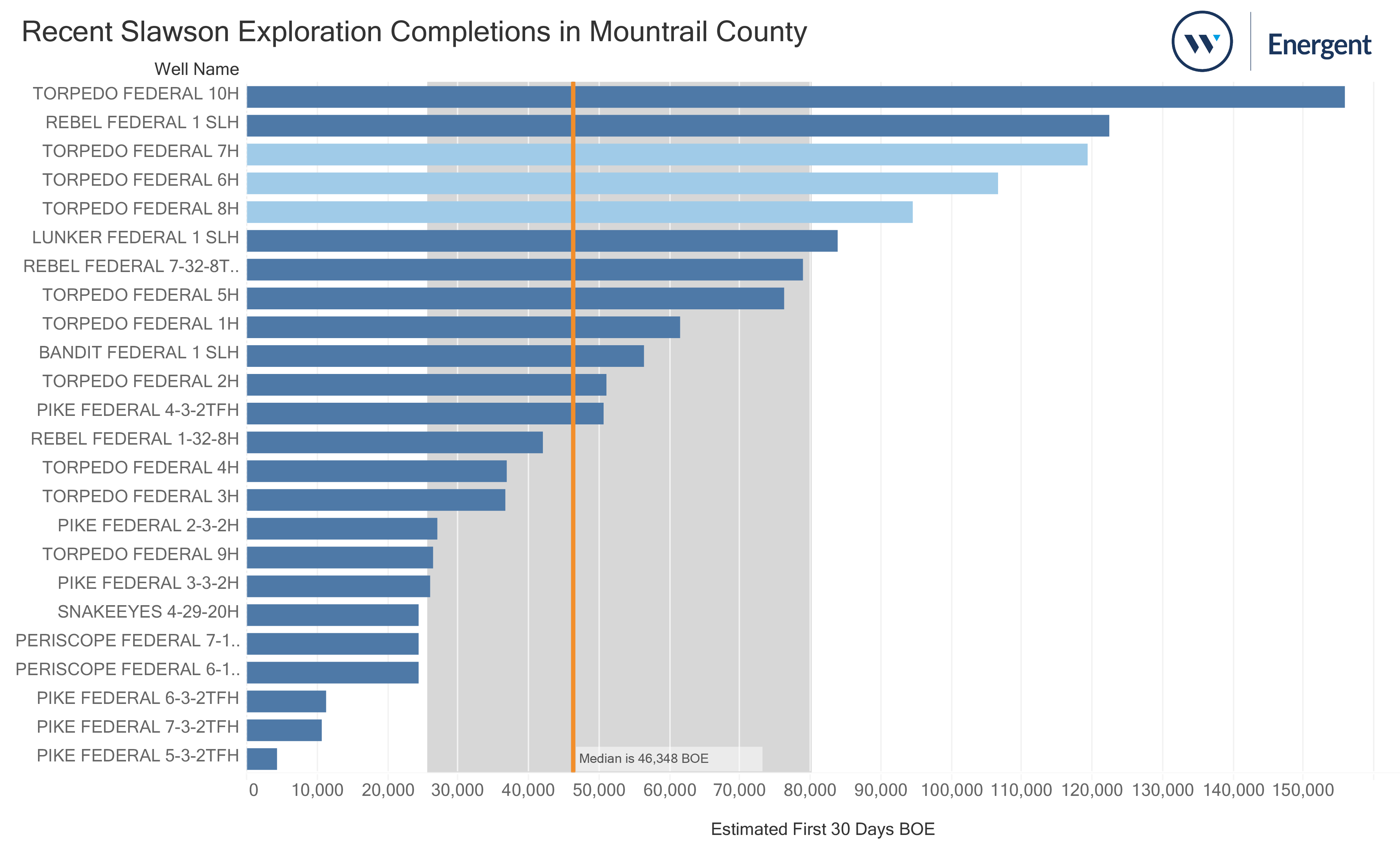 The Torpedo Federal 6h was completed December 25 with a vertical depth of 9,875 ft and a measured depth of 21,491 ft. The 12,187 ft lateral starts 499 S 380 W from the wellhead. The well produced 3,205 bbl of oil, 2,112 MMcf of gas and 3,362 bbl of water during the initial well test. Calfrac supplied the frac horsepower, proppant, and the chemicals for the Slawson frac job.