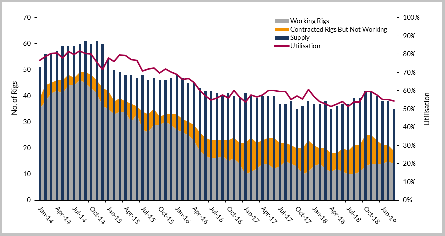 Drilling contractors finally reacted in late first quarter 2017 by retiring older assets, which resulted in a supply decline of 9 rigs by the end of that year. Since then, despite a few dips and coupled with a demand uptick, the market has experienced a bit of improvement with utilisation reaching 53% in early March 2019.