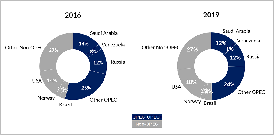 OPEC and non-OPEC share of global liquids production, 2016 vs 2019